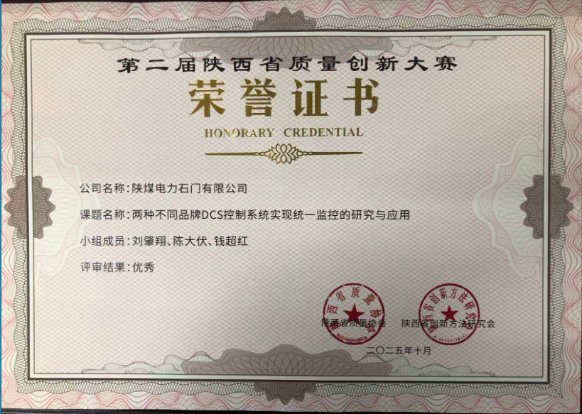 近日,在第二屆陜西省質(zhì)量創(chuàng)新大賽中,陜煤電力石門有限公司申報《兩種不同品牌DCS控制系統(tǒng)實現(xiàn)統(tǒng)一監(jiān)控的研究與應(yīng)用》榮獲優(yōu)秀獎。《...